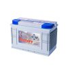 De 12 volt 95 ah AGM accu type AGM ST95 (Absorbing Glass Material = Het zuur wordt door de glasvezel tussen de loodplaten opgenomen zodat het niet meer vloeibaar is).