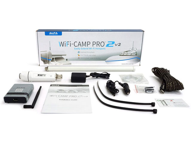 De WiFi-Camp Pro2v2 wifi extender & router is de opvolger van de populaire WiFi-Camp Pro2 van fabrikant Alfa Network. Dit model is net weer wat sneller en de vernieuwde Tube-UNA maakt het geheel nog stabieler dan zijn voorloper. De Camp Pro 2v2  is dé wifi-antenne en router voor op en rondom de camper, caravan en boot. De WiFi-Camp Pro2v2 verspreidt het aangeboden wifi-signaal, waardoor u met verschillende gebruikers en devices gebruikmaakt van een krachtig wifi-signaal. Deze set kan niet overweg met de 4G antenne van Alfa network, de aanwezige R36A router kan alleen overweg met de Tube-UNA en is hierdoor alleen voor de aanvoer van WiFi signaal.