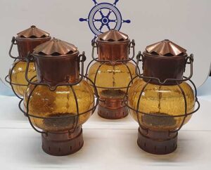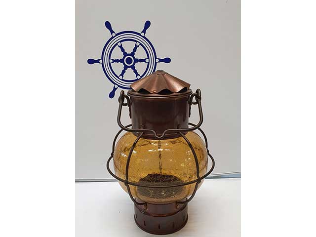 Massief koper scheeps bollantaarn met geel glas en voorzien van E27 lampfitting in de boven deksel.