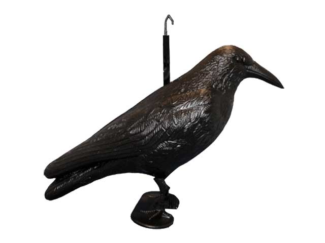 Deze zwarte kraai heeft een afmeting van 13 x 11 x 38cm en weegt ongeveer 200 gram.
