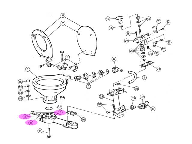 Jabsco onderstuk voor alle handpomp toilet modellen.