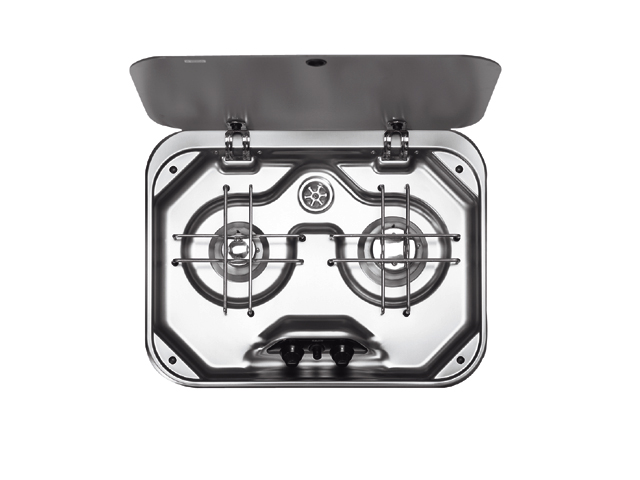 RVS inbouw kooktoestel Dometic 2 vlams met boven bediening en glazen afdekplaat.