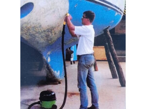 Afval wordt door de holle kern weggezogen terwijl je verf, lak, antifouling en andere stoffen afschraapt.