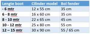 Bij een bootlengte tot 10 meter dienen er aan elke zijde minimaal 2 fenders aanwezig te zijn, vanaf 10 meter adviseren wij 3-4 fenders per zijde, afhankelijk van het type boot.